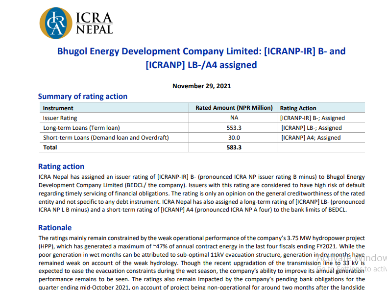 काठमाडौं । भूगोल इनर्जी डेभलपमेन्ट कम्पनी लिमिटेडले इक्रा नेपालमा क्रेडिट रेटिङ गराएको छ । इक्रा नेपालले उक्त कम्पनीलाई इक्रा एनपी आईआर बी माइनस रेटिङ दिएको हो । इक्राले उक्त रेटिंग पाउने निकायहरु समयमा वित्तीय दायित्व पुरा गर्न चुक्ने सम्बन्धमा उच्च जोखिम रहेको मानिने बताएको छ ।