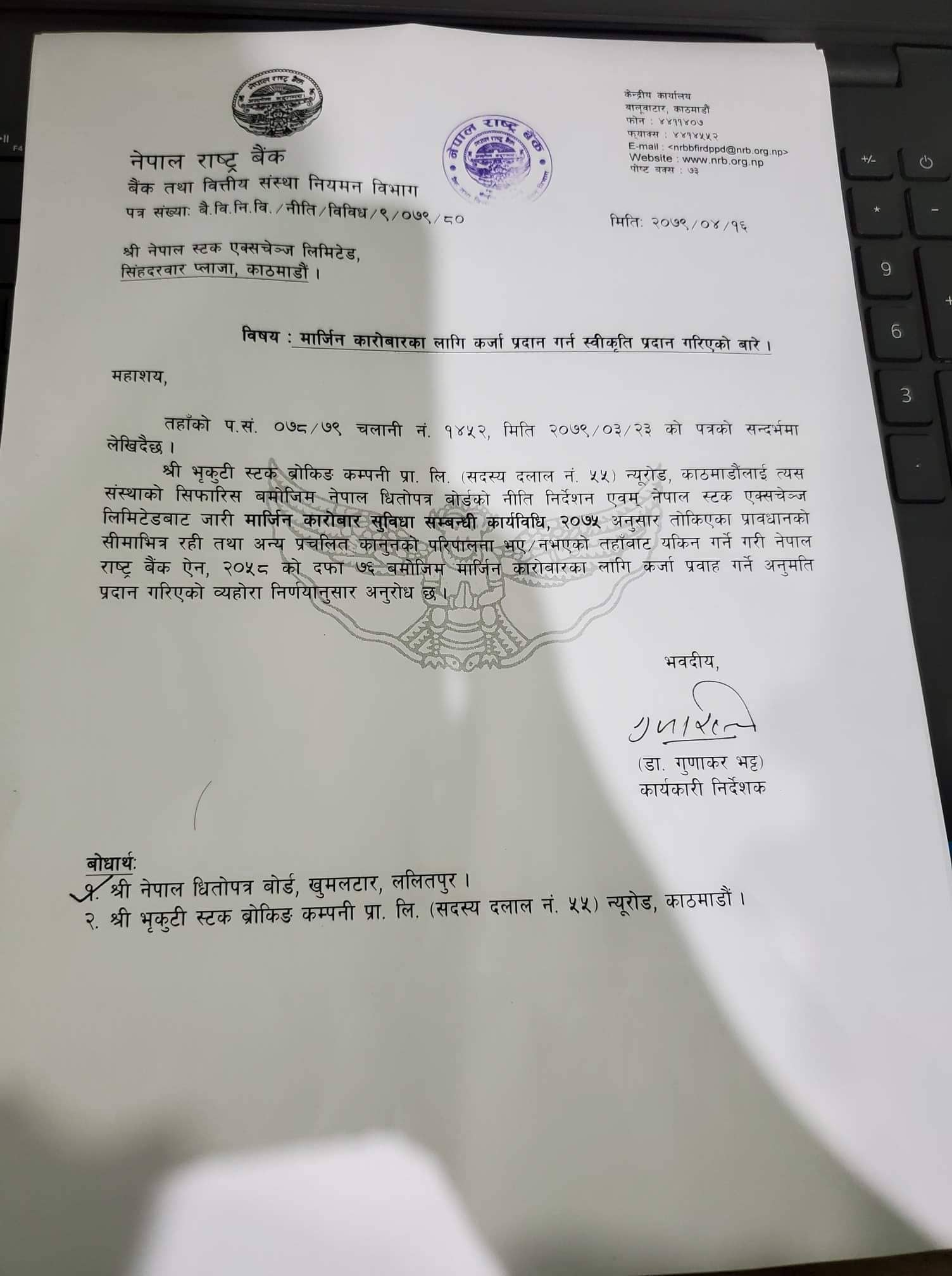 भृकुटीलाई नेपाल धितोपत्र बोर्डको नीति निर्देशन एवम् नेपाल स्टक एक्सचेन्जबाट जारी मार्जिन कारोबार सुविधा सम्बन्धी कार्यविधि २०७५ अनुसार तोकिएको प्रावधानको सिमाभित्र रहेर काम गर्न राष्ट्र बैंकले निर्देशन दिएको छ । प्रचलित कानुनको परिपालना भए/नभएको यकिन गर्ने गरी नेपाल राष्ट्र बैंक ऐन २०५८ को दफा ७६ बमोजिम मार्जिन कारोबारको लागि कर्जा प्रवाह गर्ने अनुमनि प्रदान गरिएको हो ।