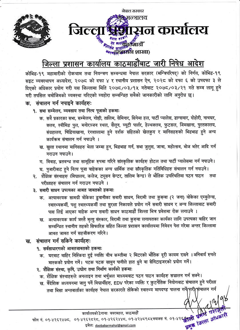 कोरोना भाइरस संक्रमणका कारण काठमाडौं उपत्यकामा गत वैशाख १६ गते निषेधाज्ञा जारी छ ।