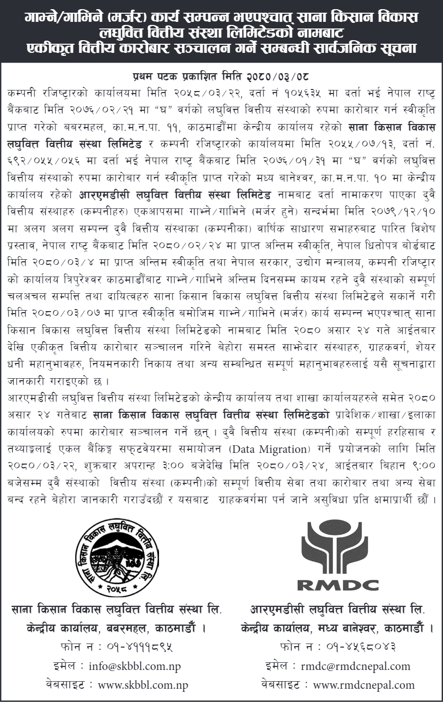 काठमाडौं । साना किसान लघुवित्त र आरएमडिसी लघुवित्तले भोलि असार २४ गतेदेखि एकिकृत कारोबार गर्ने भएका छन् । यी दुई लघुवित्तले मर्जर प्रक्रिया पुरा गरी साना किसान विकास लघुवित्तको नामबाट एकिकृत कारोबार गर्न लागेका हुन् ।