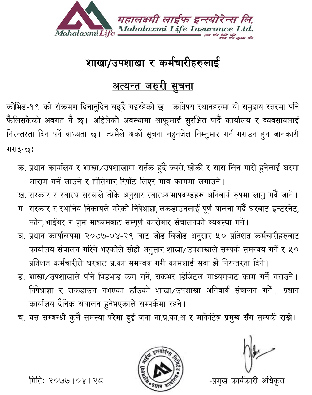 महालक्ष्मी लाईफले मन्त्रिपरिषदको सोही निर्णयको मर्म अनुसार र कर्मचारी तथा कोरोना महामारीको समयमा भिडभाड हुन नदिन आधा कर्मचारीले कार्यालय सञ्चालन गर्ने निर्णय गरेको हा । सो कम्पनीले कोरोना भाइरसको संक्रमण गरेर स्थानीय सरकारले लकडाउन, निषेधाज्ञा जारी गरेका क्षेत्रमा सो लकडाउन र निषेधाज्ञा पालना गर्ने जनाएको छ ।