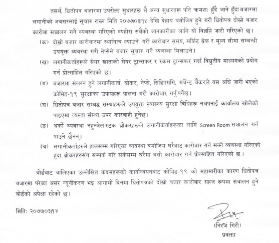 नेप्सेले नेपाल धितोपत्र बोर्डबाट शेयर बजार सुचारु गर्न लिखित पत्र आएको जनाएको छ । आजै बसेको बोर्ड बैठकले निर्णय गरेपछि नेप्सेलाई पत्र लेखेर भोलिबाट शेयर बजार सुचारु गर्न निर्देशन दिइएको बोर्डका प्रबक्ता निरज गिरीले बताए ।