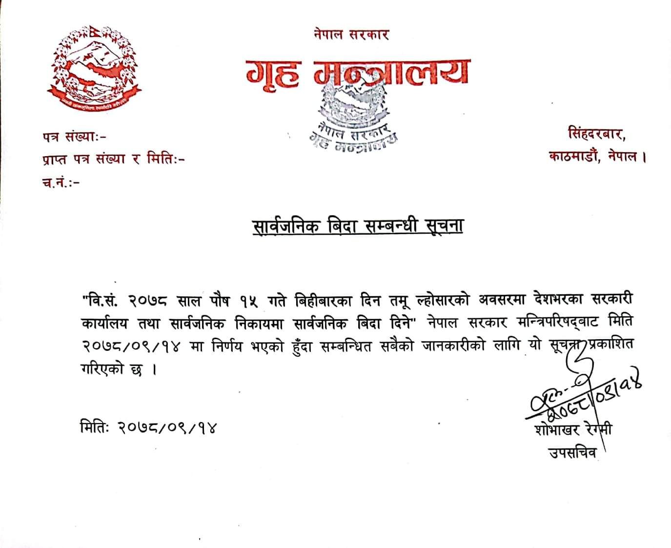 गृह मन्त्रालयको सिफारिसमा सरकारले विदा दिने निर्णय गरेको हो। सरकारले सार्वजनिक विदा दिएसँगै देशभरका सरकारी कार्यालय तथा सार्वजनिक निकाय समेत विदा हुनेछ।