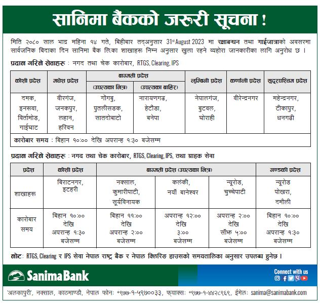 काठमाडौं । सानिमा बैंकले भोलि भदौ १४ गते सार्वजनिक बिदाको दिन समेत बैंकिङ सेवा प्रदान गर्ने भएको छ । सरकारले भोलि बिहिबार रक्षाबन्धन तथा गाईजात्राको अवसरमा देशभर सार्वजनिक बिदा दिएपनि यस बैंकले ग्राहकहरुको आवश्यकतालाई मध्यनजर गर्दै सेवा प्रदान गर्ने जनाएको छ । बैंकले सातै प्रदेशका विभिन्न शाखा कार्यालयहरु मार्फत सेवा दिने जनाएको छ ।