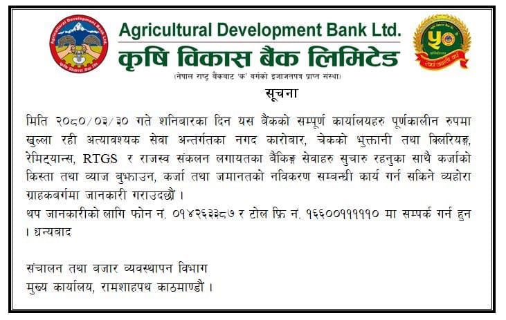 त्यसैगरी कृषि विकास बैंकले पनि आफ्नो सेवाहरु पुर्णकालीन रुपमा खुला गर्ने जनाएको छ ।