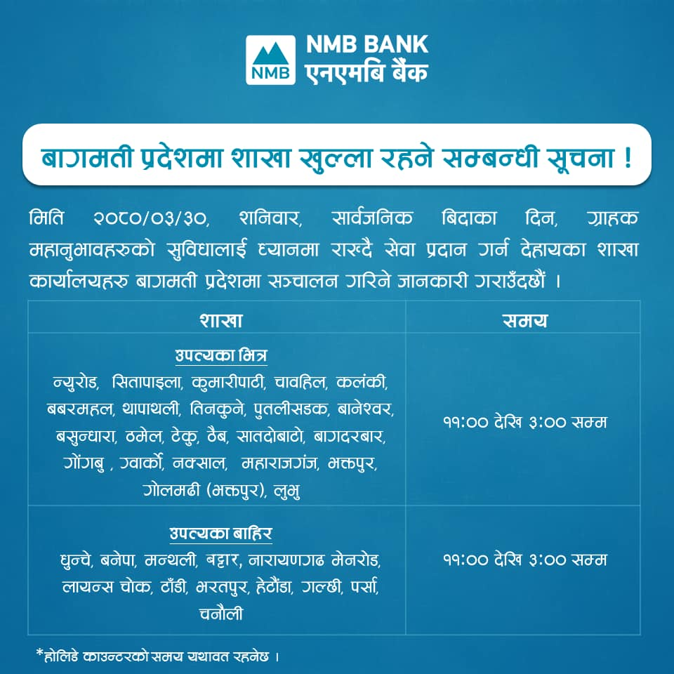 त्यस्तै, एनएमबि बैंक लिमिटेडले पनि अधिकांश शाखा खुला गरी सेवा दिने जनाएको छ । कम्पनीले एक सूचना प्रकाशित गर्दै ग्राहकहरुको आवश्यकतालाई मध्यनजर गर्दै सेवा सुचारु राख्ने जनाएको छ । बैंकले सातै प्रदेशका अधिकांश शाखाबाट विभिन्न समयमा खुलाई सेवा प्रवाह गर्ने जनाएको हो ।