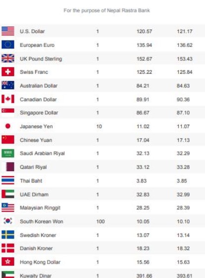 त्यस्तै, युरोपियन युरो एकको खरिददर १३५ रुपैयाँ ९४ पैसा र विक्रिदर १३६ रुपैयाँ ६२ पैसा र युके पाउन्ड स्ट्रिलिङ एकको खरिददर १५२ रुपैयाँ ६७ पैसा र बिक्रिदर १५३ रुपैयाँ ४३ पैसा रहेको नेपाल राष्ट्र बैंकले जनाएको छ ।