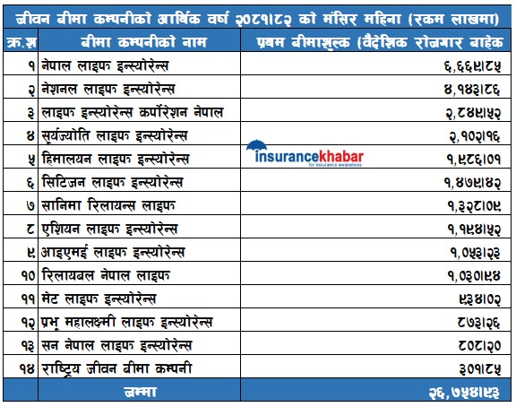 यता सूर्यज्योति लाइफले २१ करोड २ लाख रुपैयाँ प्रथम बीमा शुल्क (वैदेशिक रोजगार बाहेक) संकलन गरेको छ । हिमालयन लाइफले १९ करोड ८६ लाख रुपैयाँ प्रथम बीमा शुल्क (वैदेशिक रोजगार बाहेक) संकलन गरेको छ । सिटिजन लाइफले १४ करोड ७९ लाख रुपैयाँ प्रथम बीमा शुल्क (वैदेशिक रोजगार बाहेक) संकलन गरेको छ । सानिमा रिलायन्स लाइफले १३ करोड २८ लाख रुपैयाँ प्रथम बीमा शुल्क (वैदेशिक रोजगार बाहेक) संकलन गरेको छ ।