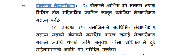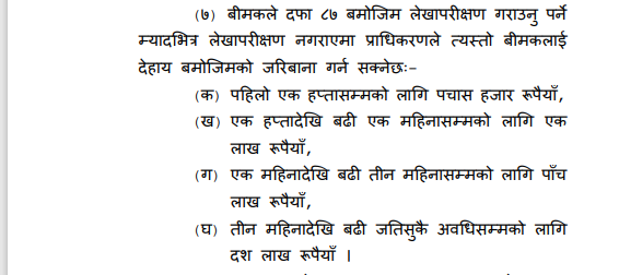 तीन महिना भित्र लेखापरीक्षण सम्पन्न गर्न नसकेका कम्पनीले मुनासिव कारण देखाएमा थप २ महिनाको म्याद दिन सक्नेछ । यदि बीमा कम्पनीहरुले पहिलो तीन र थप २ महिना भित्रमा लेखापरीक्षण प्रतिवेदन तयार नपारेमा अधिकतम १० लाख रुपैयाँसम्म जरिवाना तिर्नु पर्ने भएको छ ।
