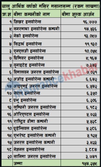 त्यस्तै, बीमा समितिको तथ्याङ्क अनुसार लुम्बिनी जनरल इन्स्योरेन्स कम्पनीले ६१ करोड ४२ लाख रुपैयाँ, ओरिएण्टल इन्स्योरेन्स कम्पनीले ५७ करोड २३ लाख रुपैयाँ, राष्ट्रिय बीमा कम्पनीले ५५ करोड २८ लाख रुपैयाँ, प्रुडेन्सियल इन्स्योरेन्स कम्पनीले ५२ करोड ८६ लाख रुपैयाँ, एभरेष्ट इन्स्योरेन्सले ५१ करोड २५ लाख रुपैयाँ, जनरल इन्स्योरेन्स कम्पनीले ३९ करोड २३ लाख रुपैयाँ, नेशनल इन्स्योरेन्स कम्पनीले ३८ करोड ८४ लाख रुपैयाँ र सानिमा जनरल इन्स्योरेन्स कम्पनीले ३७ करोड ४१ लाख रुपैयाँ कुल बीमा शुल्क आर्जन गरेका छन् ।