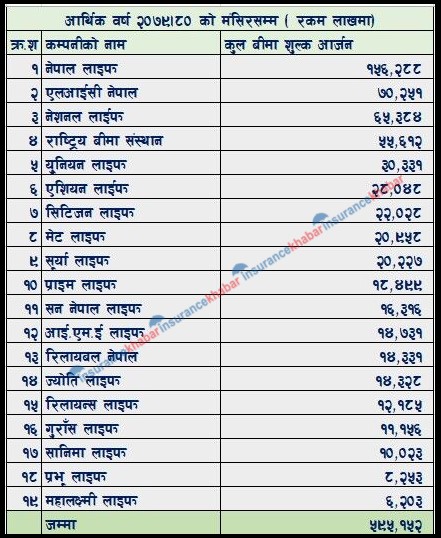 त्यस्तै, मेट लाइफले २ अर्ब ९ करोड, सूर्या लाइफले २ अर्ब २ करोड, प्राइम लाइफले १ अर्ब ८४ करोड, सन नेपाल लाइफले १ अर्ब ६३ करोड, आइएमई लाइफले १ अर्ब ४७ करोड, रिलायबल नेपाल लाइफले १ अर्ब ४३ करोड, ज्योति लाइफले १ अर्ब ४३ करोड, रिलायन्स लाइफले १ अर्ब २१ करोड, गुराँस लाइफले १ अर्ब ११ करोड, सानिमा लाइफले १ अर्ब २३ लाख रुपैयाँ कुल बीमा शुल्क आर्जन गरेका छन् ।