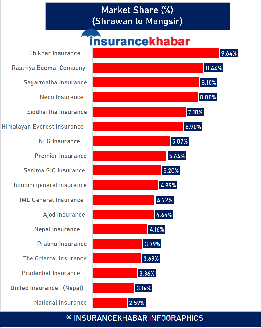 औसत भन्दा माथि बजार हिस्सा भएका कम्पनीहरुको संख्या ८ रहेको छ । शिखर इन्स्योरेन्स, राष्ट्रिय बीमा कम्पनी, सगरमाथा इन्स्योरेन्स, नेको इन्सुरेन्स, सिद्धार्थ इन्स्योरेन्स, हिमालयन एभरेष्ट इन्स्योरेन्स, एनएलजी इन्स्योरेन्स र प्रिमियर इन्स्योरेन्सको बजार हिस्सा औसत भन्दा माथि छ ।