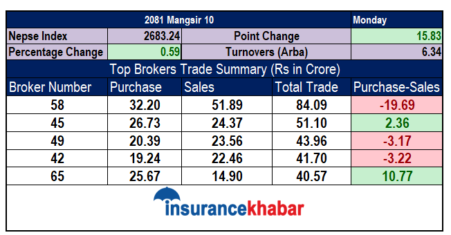 ब्रोकर नम्बर ५८ बाट ८४ करोड ९ लाख रुपैयाँको कारोबार भएको छ। जसमा ३२ करोड २० लाख रुपैयाँको खरिद रहेको छ भने ५१ करोड ८९ लाख रुपैयाँको बिक्री भएको छ।