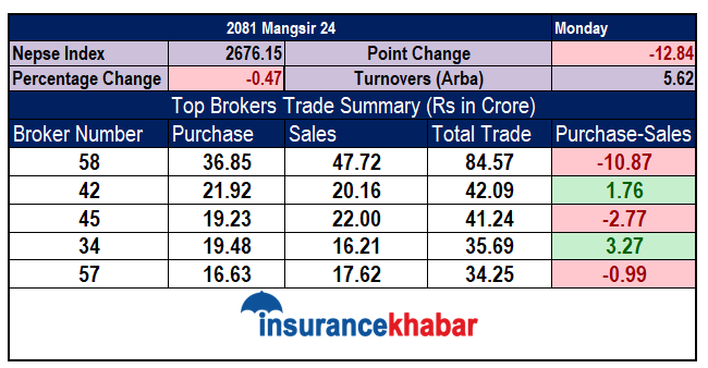 बजारमा ५ अर्ब ६२ करोड रुपैयाँको कारोबार भएको दिन ब्रोकर नम्बर ५८ बाट सर्वाधिक रकमको कारोबार भएको छ। ब्रोकर नम्बर ५८ बाट ८४ करोड ५७ लाख रुपैयाँको कारोबार भएको छ। जसमा ३६ करोड ८५ लाख रुपैयाँको खरिद भएको छ भने ४७ करोड ७२ लाख रुपैयाँको बिक्री छ।