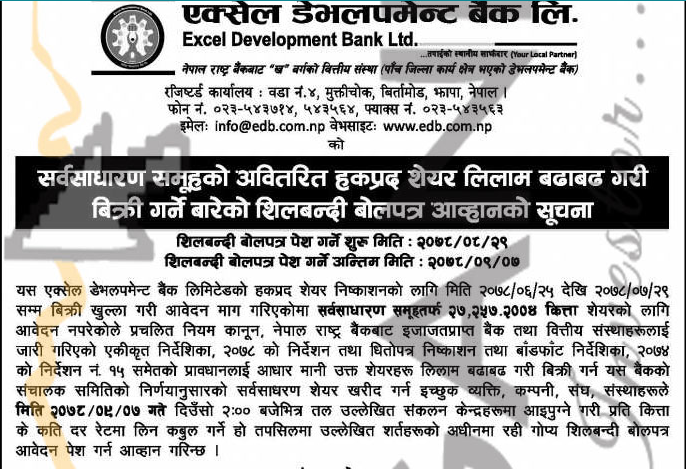 मंसिर २९ गतेदेखि एक्सेल डेभलपमेण्ट बैंकको अवितरित हकप्रद शेयर लिलामीमा