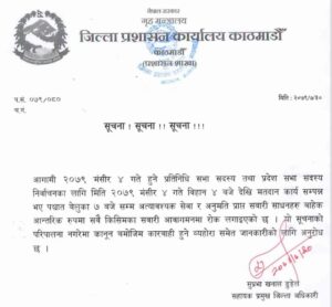 मंसिर ४ गते विहान ४ बजेदेखि मतदान कार्य सम्पन्न भएपश्चात बेलुकी ७ बजेसम्म सवारी साधन ठप्प रहनेछ । उक्त समयमा अत्यावश्यक सेवा अनुमति प्राप्त सवारी साधनहरु बाहेक अन्य सबै सवारी आवगमनमा रोक लगाएको छ । नियम परिपालना नगरेको अवस्थामा कानून बमोजिम कारबाही गर्ने जिल्ला प्रशासन कार्यलय काठमाडौंले जनाएको छ ।