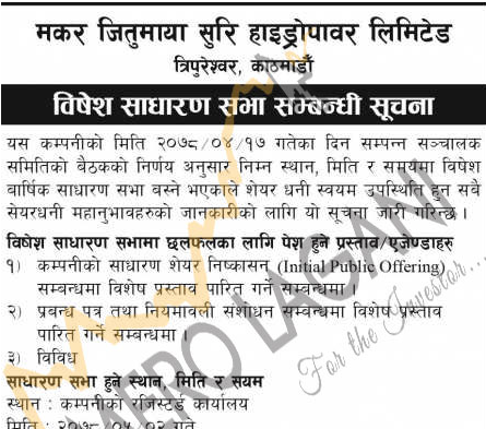 उक्त विशेष सभाले आईपीओ निष्काशन गर्ने, कम्पनीको प्रवन्धपत्र र नियमावलीमा संशोधन गर्ने लगायतका विविध विषयमा छलफल गर्ने जनाएको छ ।