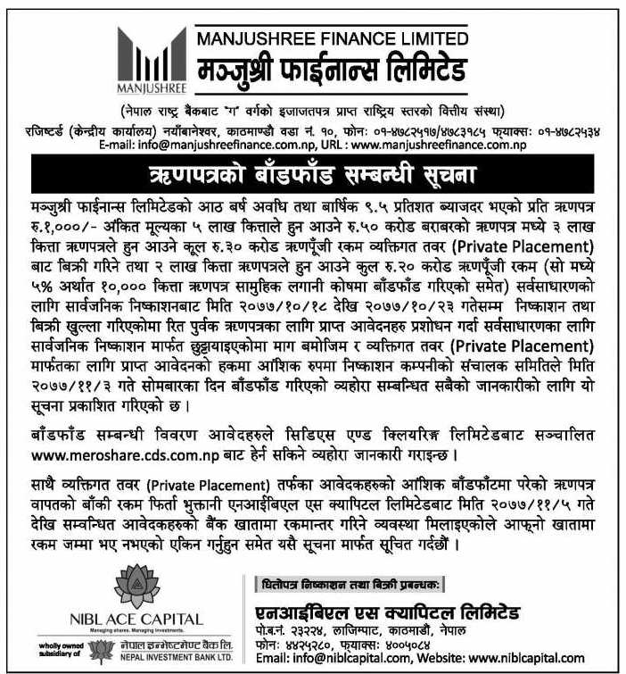फाइनान्सले ८ वर्ष अवधिको लागि ‘९।५ प्रतिशत, ८ वर्ष मञ्जुश्री फाइनान्स लिमिटेड डिबेन्चर २०८५’ नाममा ५० करोड रुपैयाँ बराबरको ५ लाख कित्ता ऋणपत्र निष्काशन तथा बिक्री खुला गरेको थियो । जसमध्ये फाइनान्सले सर्वसाधारणका लागि २ लाख कित्ता र व्यक्तिगत रुपमा विभिन्न संघ संस्थालाई ३ लाख कित्ता बिक्री खुल्ला गरेको हो ।