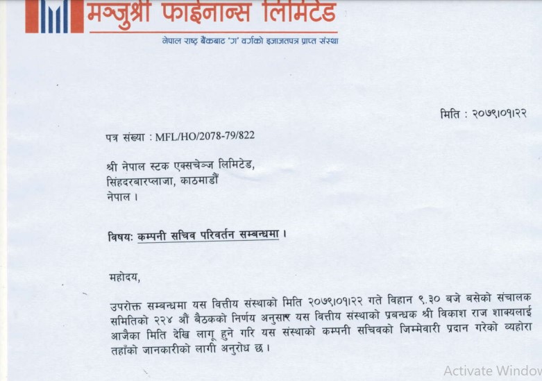 काठमाडौं । मञ्जुश्री फाइनान्सको कम्पनी सचिव परिवर्तन भएका छन् । कम्पनीको बैशाख २२ गते बसेको सञ्चालक समितिको बैठकले यसअघि प्रबन्धक रहेका विकाश राज शाक्यलाई आज बैशाख २२ गते बिहीवारदेखि लागू हुने गरी कम्पनी सचिवको जिम्मेवारी दिएको कम्पनीले नेजनाएको छ ।