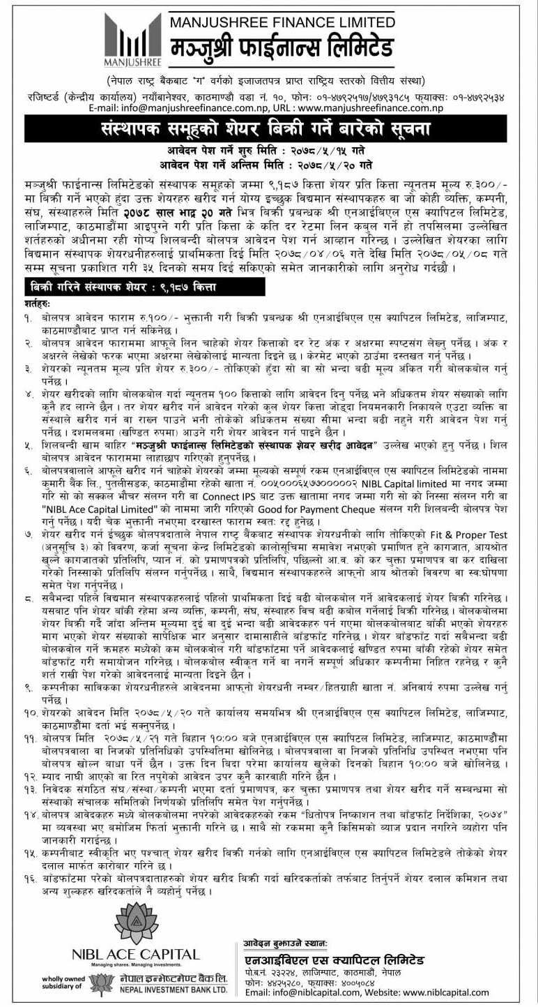 काठमाडौँ । मञ्जुश्री फाइनान्स कम्पनी लिमिटेडले आजबाट संस्थापक समूहको शेयर लिलाम बढाबढ गरी बिक्री खुल्ला गरेको छ । कम्पनीले संस्थापक समूहको ९ हजार एक सय ८७ कित्ता शेयर लिलाम बढाबढ गरी बिक्री खुल्ला गरेको हो ।