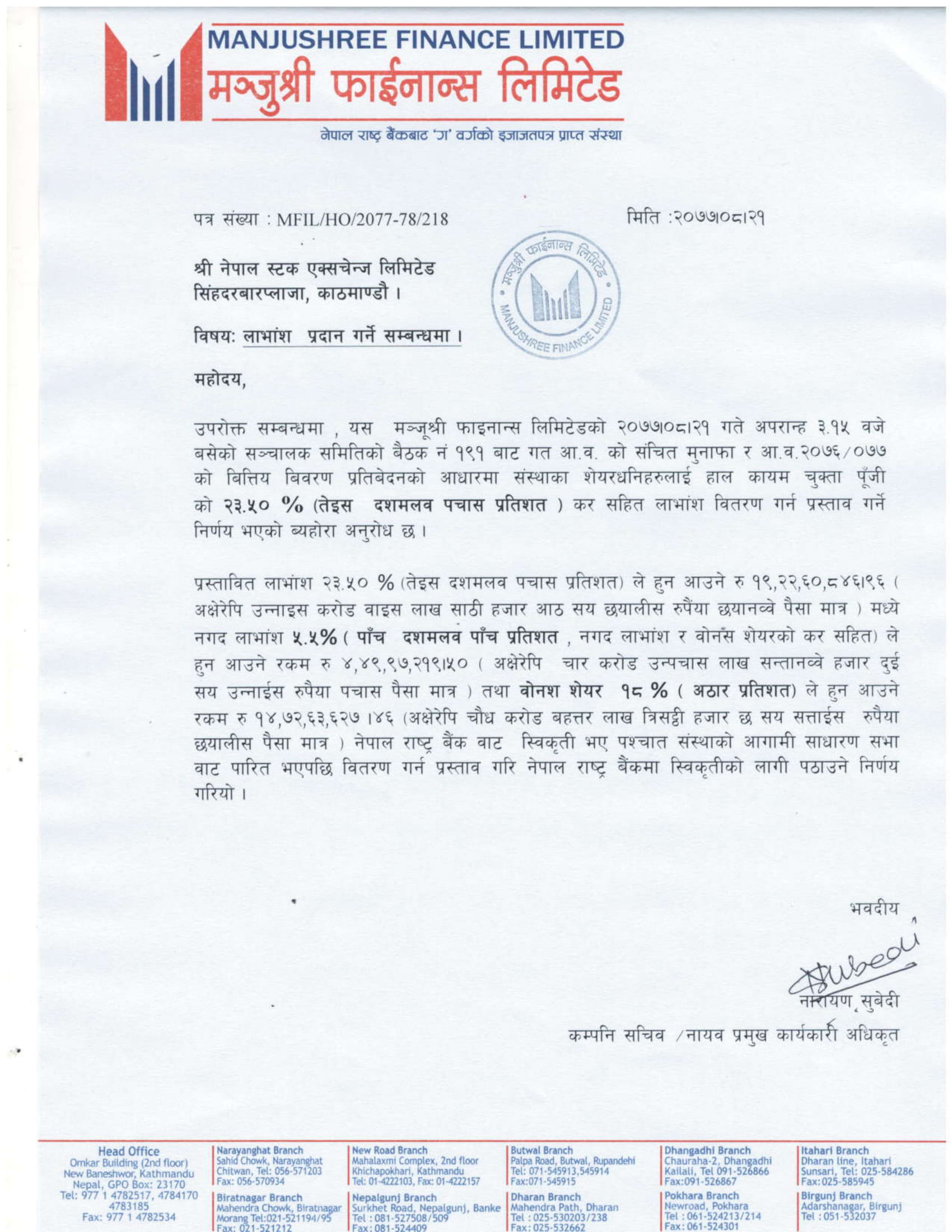 प्रस्तावित लाभांश नेपाल राष्ट्र बैंक र आगामी वार्षिक साधारण सभाले अनुमोदन गरेपछि वितरण गरिनेछ ।