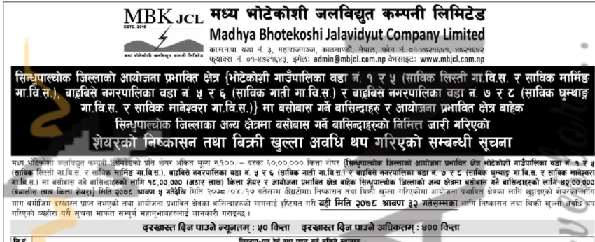 कम्पनीले आयोजना प्रभावित सिन्धुपाल्चोक जिल्लाको भोटेकोशी गाउँपालिका वडा नं. १ र ५ (साविक लिस्ती र मार्मिङ गा.वि.स), बाह्रबिसे नगरपालिका वडा नं. ५ र ६ (साविक गाती गा.विस) तथा बाह्रबिसे नगरपालिका वडा नं ७ र ८ (साविक घुम्थाङ्ग र मानेश्वरा गा.वि.स) मा स्थायी बसोबास गर्ने बासिन्दा तथा आयोजनाबाट प्रभावित क्षेत्र बाहेक सिन्धुपाल्चोक जिल्लाका अन्य क्षेत्रमा स्थायी बसोबास गर्ने बासिन्दाहरु समेतको लागि कुल ६० लाख कित्ता आईपीओ विक्री खुला गरेको हो ।