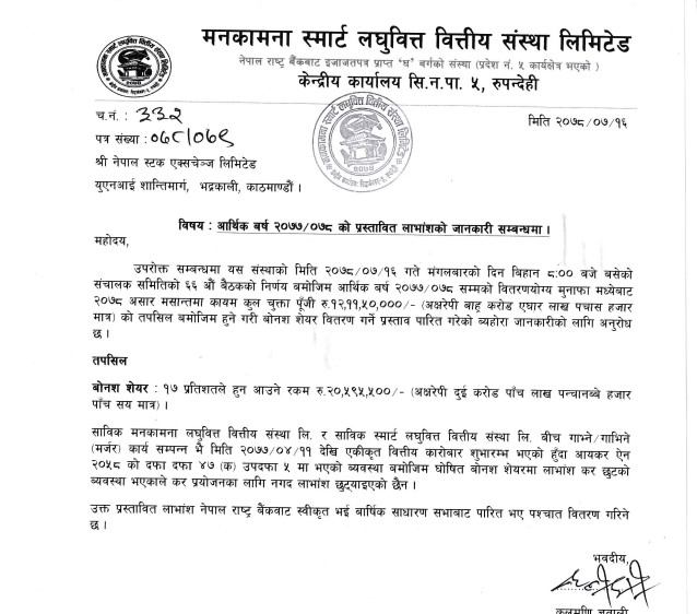काठमाडौं । मनकामना स्मार्ट लघुवित्त वित्तीय संस्था लिमिटेडले लाभांश प्रस्ताव गरेको छ । कम्पनीको कार्तिक १६ गते बसेको संचालक समितिको बैठकले गत आर्थिक वर्षको मुनाफाबाट आफ्ना शेयरधनीहरुलाई वितरण गर्ने लाभांश घोषणा गरेको हो ।