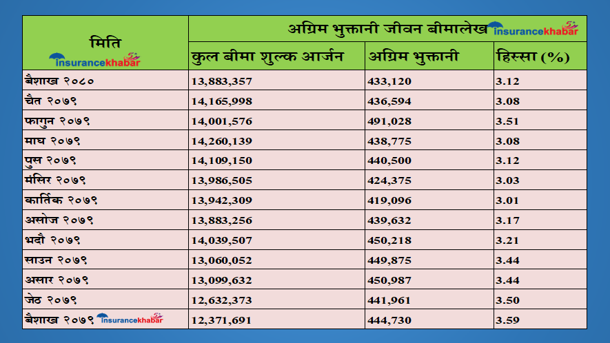 चालु आर्थिक वर्षको बैशाख महिनासम्ममा जीवन बीमा कम्पनीहरुले ४३ अर्ब ३१ करोड रुपैयाँ बीमा शुल्क आर्जन गरेका छन् । गत वर्षको यहि अवधिमा ४४ अर्ब ४७ करोड रुपैयाँ बीमा शुल्क आर्जन गरेका थिए । कम्पनीले बैशाख महिनासम्ममा १३ खर्ब ८८ अर्ब रुपैयाँ बीमा शुल्क बर्जन गरेका छन् । जसमा मनि व्याक पोलिसीको हिस्सा ३.१२ प्रतिशत रहेको छ ।