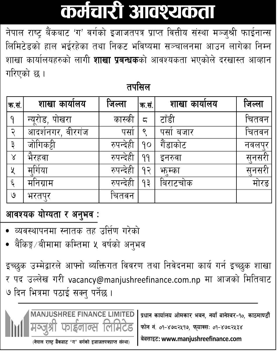काठमाडौं । मञ्जुश्री फाईनान्स कम्पनी लिमिटेडले ठूलो संख्यामा कर्मचारीको माग गरेको छ । कम्पनीले १३ वटा शाखाका लागि शाखा प्रबन्धक माग गरेको जनाएको छ ।