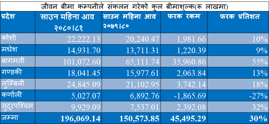 साउन महिनामा बीमा कम्पनीकाे कूल बीमाशुल्क आम्दानी बागमती प्रदेशमा सर्वाधिक ५५ प्रतिशतले बढेकाे छ। बागमती प्रदेशबाट जीवन बीमा कम्पनीले १० अर्ब १० कराेड ७२ लाख रुपैयाँ कूल बीमाशुल्क आम्दानी गरेका छन् । कूल बीमाशुल्क आम्दानीमा दाेश्राे धेरै वृद्धि सुदूरपश्चिम प्रदेशमा देखिएकाे छ। सुदूरपश्चिममा गत आवकाे साउनमा ७५ कराेड ३७ लाख रुपैयाँ कूल बीमाशुल्क आर्जन भएकाेमा चालू आव २०८०।८१ काे साउन महिनामा ३२ प्रतिशतले वृद्धि भएर ९९ कराेड २९ लाख रुपैयाँ पुगेकाे छ।