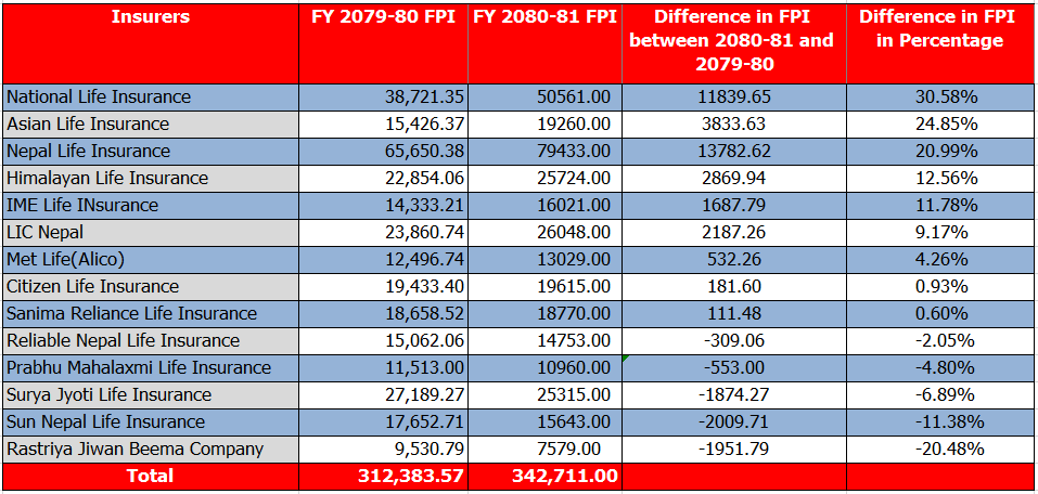 नेशनल लाइफ इन्स्योरेन्सले सर्वाधिक ३०.५८ प्रतिशतले प्रथम बीमाशुल्क आम्दानी बढाउन सफल भएको छ। यसले ५ अर्ब ५ करोड ६१ लाख रूपैयाँ प्रथम बीमाशुल्क संकलन गरेको छ। दोश्रोमा एशियन लाइफ इन्स्योरेन्सले २४.८५ प्रतिशतले प्रथम बीमाशुल्क आम्दानी बढाएर १ अर्ब ५४ करोड रूपैयाबाट १ अर्ब ९२ करोड रूपैयाँ पुर्याएको छ। अघिल्लो आर्थिक वर्ष २०७९।८० मा यसको प्रथम बीमाशुल्क आम्दानी उल्लेख्यरूपमा खुम्चिएको थियो ।