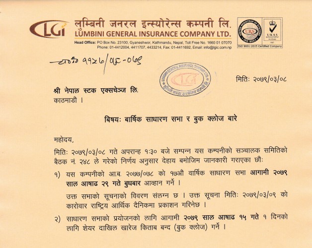 मर्जरको प्रस्ताव सहित लुम्बिनी जनरलले बोलायो साधारण सभा, १०% लाभांश पारित गर्ने