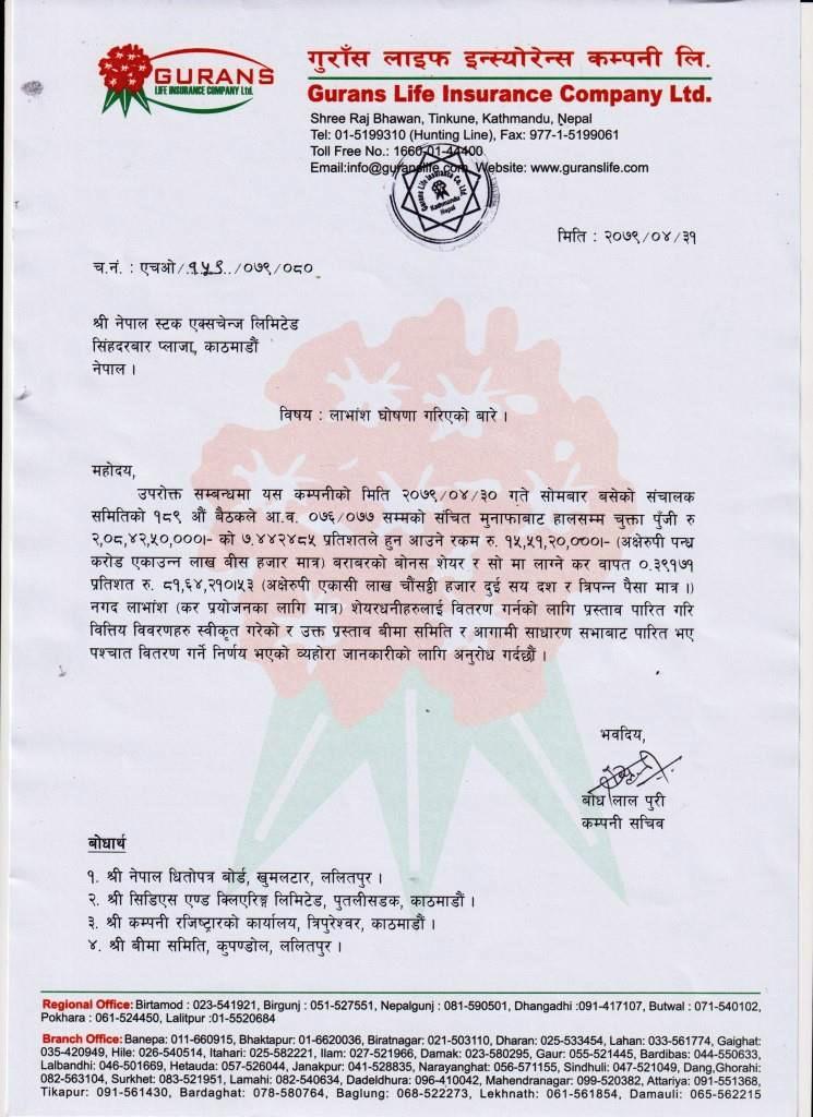 प्रस्तुत लाभांश कम्पनीको साधारणसभा पश्चात शेयरधनीहरुले प्राप्त गर्नेछन् । मर्जरको सहमति गरेका कारण अहिले कम्पनीको शेयर कारोबार बन्द छ । मर्जरको अन्तिम अवस्थामा पुगेको भनिएको मर्जर पुर्ण नहुँदै गुराँसले भने अघिल्लो आर्थिक वर्षमा पाकेको मुनाफा वितरण गर्ने भएको हो ।