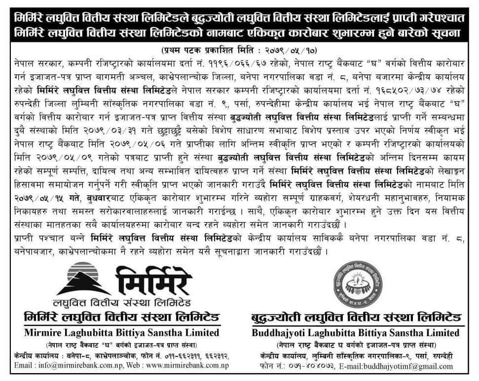 काठमाडौं । मिर्मिरे लघुवित्त वित्तीय संस्था लिमिटेड र बुद्धज्योती लघुवित्त वित्तीय संस्था लिमिटेडले भदौ १५ गतेदेखि एकिकृत कारोबार शुरु गर्ने भएका छन् । मिर्मिरे लघुवित्त वित्तीय संस्था लिमिटेडले बुद्धज्योती लघुवित्त वित्तीय संस्था लिमिटेडलाई प्राप्ती गरी मिर्मिरे लघुवित्त वित्तीय संस्था लिमिटेडको नामबाट एकिकृत कारोबार शुरु गर्न लागेका हुन् ।