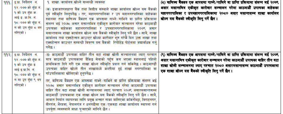 काठमाडौं । बाणिज्य बैंकहरु एक आपसमा गाभ्ने गाभिने वा प्राप्ति प्रकृयामा संलग्न भई २०७९ असार मसान्तभित्र एकीकृत कारोबार सञ्चालन गरेमा काठमाडौं उपत्यका सहित महानगरपालिका तथा उपमहानगर पालिकामा शाखा कार्यालय सञ्चालन गर्न नेपाल राष्ट्र बैंकबाट स्वीकृति लिनु नपर्ने भएको छ ।