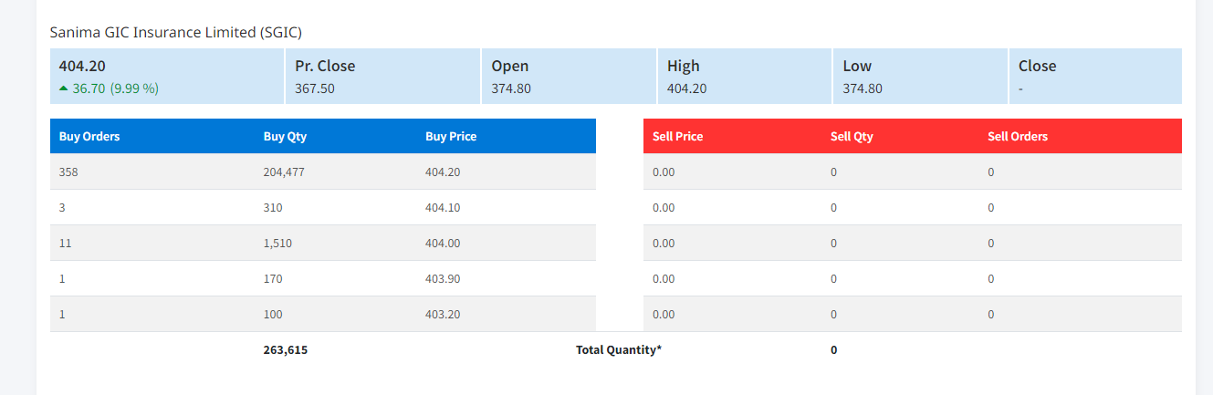 कारोबारका लागि ‘SGIC’ कोड दिएको छ । आजको पहिलो कारोबारमै ९.९९ प्रतिशतले बढेर ४०४.२० रुपैयाँ कायम भएको छ । अहिलेसम्मको अवस्थामा सानिमा जिआइसीको शेयर कारोबारका लागि खरिद कर्ता मात्रै बढि छ । बिक्री चाप सून्य छ ।