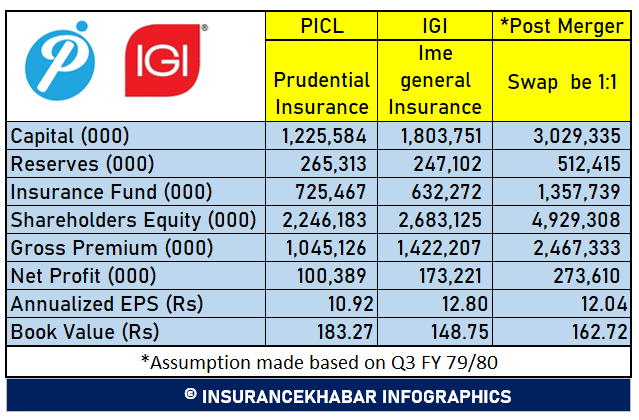 प्रुडेन्सियल इन्स्योरेन्सको किताबी मूल्य १८३ रुपैयाँ २७ पैसा छ भने आइएमई जनरल इन्स्योरेन्सको किताबी मूल्य १४८ रुपैयाँ ७५ पैसा छ । मर्जर पश्चात दुई कम्पनीको किताबी मूल्य १६२ रुपैयाँ ७२ पैसा हुने छ ।