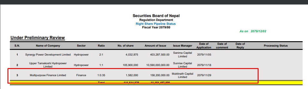कम्पनीले फागुन २९ गते बार्डमा निवेदन दिएको हो । हकप्रद शेयर निष्काशन तथा विक्री प्रबन्धक मुक्तिनाथ क्यापिटल लिमिटेड रहेको छ ।