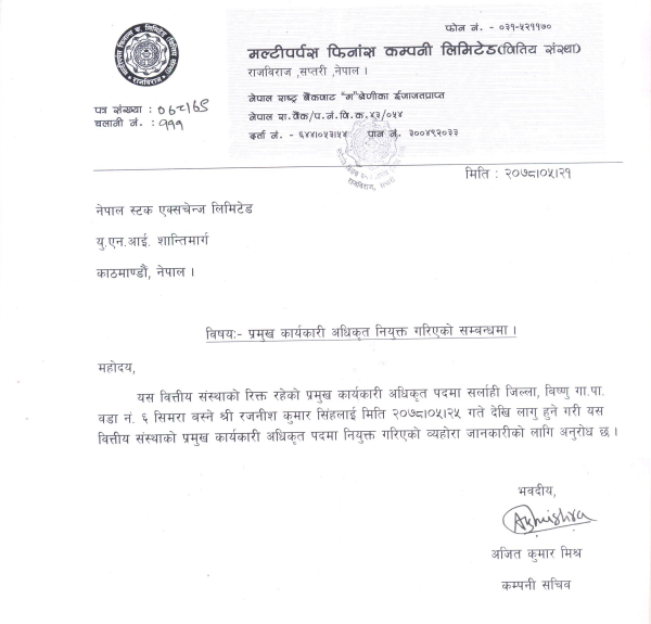 काठमाडौं । मल्टीपर्पस फिनांस कम्पनीको प्रमुख कार्यकारी अधिकृत (सिइओ) मा रजनीश कुमार सिंह नियुक्त भएका छन् । कम्पनीमा भदौ २५ गतेदेखि लागू हुने गरी रिक्त रहेको सिइओ पदमा उनलाई नियुक्त गरेको कम्पनीले जनाएको छ ।