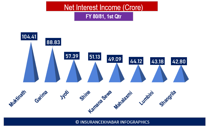 राष्ट्रिय स्तरका ८ विकास बैंक मध्ये मुक्तिनाथ विकास बैंकले सर्वाधिक १ अर्ब ४ करोड खुद व्याज आम्दानी गर्दा दोश्रोमा गरिमा विकास बैंकले ८८ करोड ८३ लाख खुद व्याज आम्दानी गरेको छ । सबै भन्दा थोरै खुद व्याज आम्दानी सांग्रिला डेभलपमेन्ट बैंकले ४२ करोड ८० लाख गरेको छ।