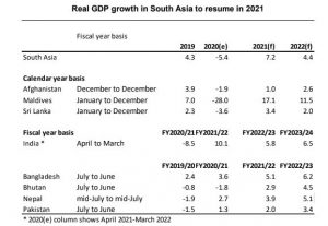 विश्व बैंकले आज सार्वजनिक गरेको एक अध्ययन प्रतिवेदन अनुसार दक्षिण एशियाको अर्थतन्त्र दुई वर्षमा पुरानै अवस्था आउने प्रक्षेपण गरेको छ । दक्षिण एशियामा आर्थिक सुधारका सम्भावनाहरु बढिरहेको बैंकले जनाएको छ । कोभिड १९ ले आर्थिक बृद्धिदरलाई पुर्याएको असर वाउन्स भए पनि रिकभर हुन अझै समय लाग्ने विश्व बैंकको प्रक्षेपण छ ।