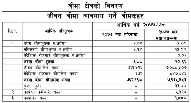 हालसम्मको तथ्याङ्क अनुसार हालसम्म कूल कायम हुन आएको बीमा पोलिसीको संख्या ७९ लाख ३५ हजार ५५३ वटा पोलिसी पुगिसकेको छ । कोरोना महामारीमा देश लकडाउनमा अल्झिदै गर्दा जीवन बीमा शुल्क आर्जन सात अर्ब नाघेको छ । १९ वटै जीवन बीमा कम्पनीहरुले सात अर्ब ८८ करोड रुपैयाँ प्रथम बीमा शुल्क र नविकरण बीमा शुल्क आर्जन गरेका छन् । सो मध्ये दुई अर्ब ७४ करोड रुपैयाँ प्रथम बीमा शुल्क आर्जन भएको छ भने नविकरण बीमा शुल्क पाँच अर्ब १४ करोड रुपैयाँ आर्जन गरेका छन् ।