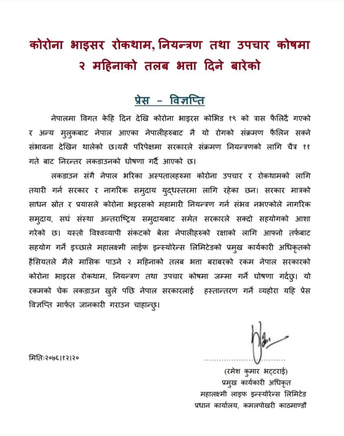 काठमाडौं । महालक्ष्मी लाइफ इन्स्योरेन्स कम्पनीका प्रमुख कार्यकारी अधिकृत रमेश कुमार भट्टराईले कोरोना भाइरस रोकथाम, नियन्त्रण तथा उपचार कोषमा दुई महिनाको तलब भत्ता दिने घोषणा गरेका छन् । उक्त भाइरसको कारण देश लकडाउनको अवस्थामा रहेको छ । विश्वव्यापी संकटको अवस्थामा नेपालीहरुको रक्षाका लागि आफ्नो तर्फबाट आफ्ले सकेको सहयोग गर्न लागेको जनाएका छन् ।