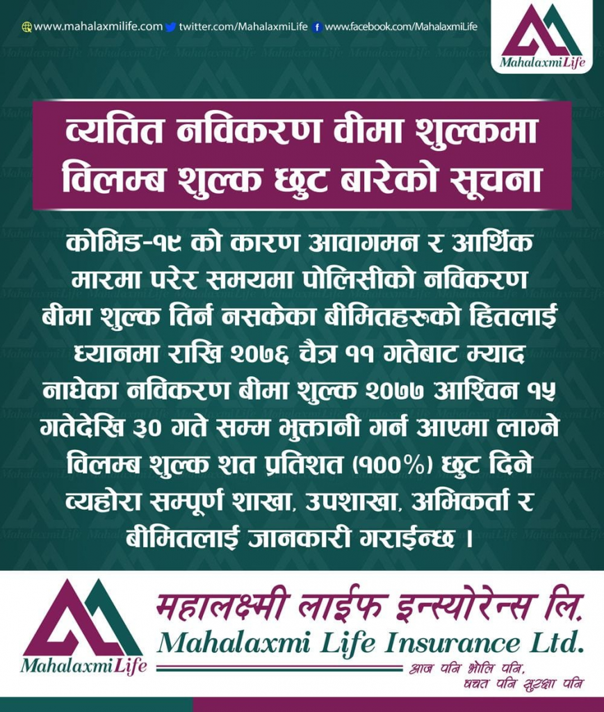 काठमाडौं । महालक्ष्मी लाइफ इन्स्योरेन्स कम्पनीले व्यतित बीमालेख नविकरण गर्दा व्याज छुट दिने भएको छ ।कम्पनीले २०७६ चैत ११ गतेबाट म्याद ननाघेको नविकरण बीमाशुल्क २०७७ असोज १५ गतदेखि ३० गतेसम्म पुनर्जागरण गराउने बीमितलाई व्याज छुट गर्ने जनाइएको छ । जसका लागि कम्पनीले अभिकर्ताहरुसँग सम्पर्क गर्न आग्रह गरेको छ ।