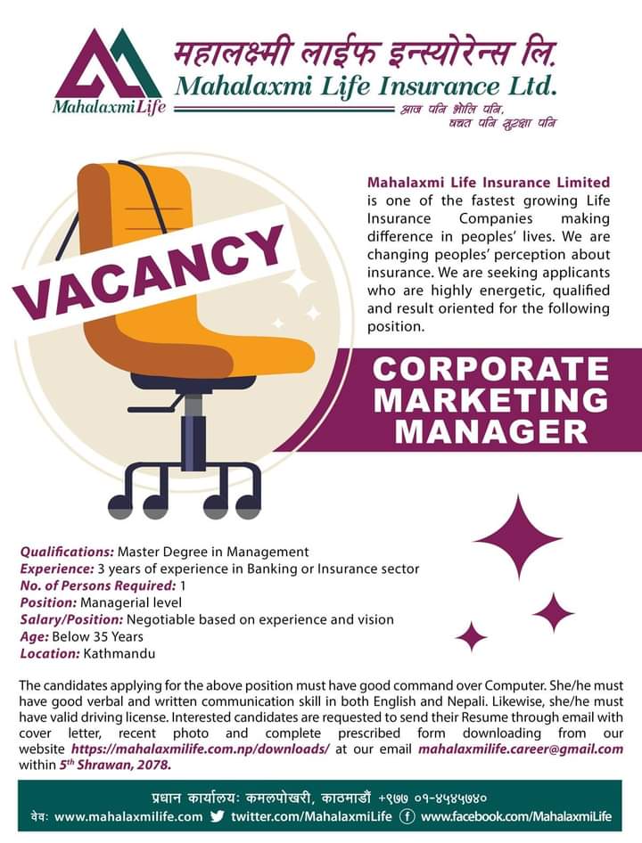 काठमाडौं । महालक्ष्मी लाइफले कर्मचारीको माग गरेको छ । कम्पनीले कर्पोरेट मार्केटिङ म्यानेजरका लागि १ जना कर्मचारीको माग गरेको हो । कम्पनीले काठमाडौं उपत्यकाका लागि कर्मचारीको माग गरेको हो ।