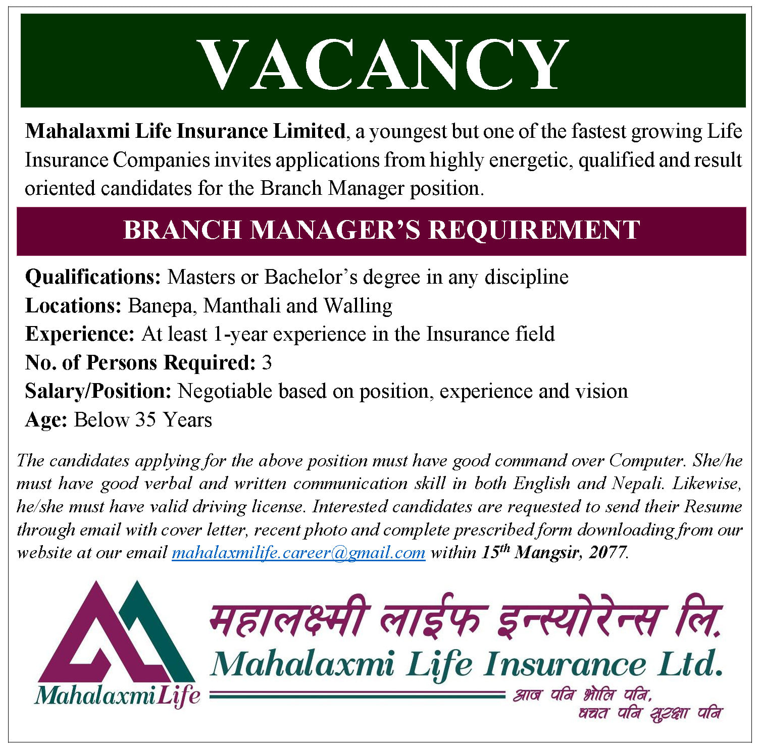 काठमाडौं । महालक्ष्मी लाइफ इन्स्योरेन्स कम्पनीले कर्मचारीको माग गरेको छ । कम्पनीले ब्रान्च म्यानेजरका लागि ३ जना कर्मचारीको माग गरेको जनाएको छ । कम्पनीले बनेपा, मन्थली र वालिङ शाखा कार्यालयका लागि कर्मचारीको माग गरेको जनाएको छ ।