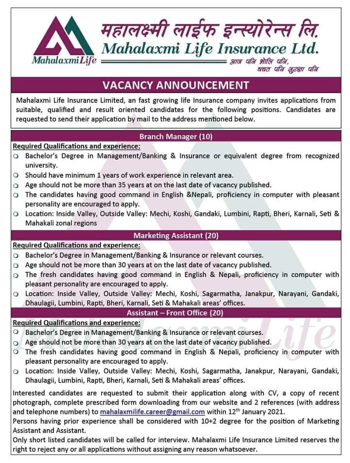 काठमाडौं । महालक्ष्मी लाइफ इन्स्योरेन्स कम्पनीले विभिन्न पदका लागि कर्मचारीको माग गरेको छ । कम्पनीले ब्रान्च म्यानेजरका लागि १० जना, मार्केटिङ असिस्टेन्टका लागि २० जना र असिस्टेन्टका लागि २० जना कर्मचारीको माग गरेको जनाएको छ ।