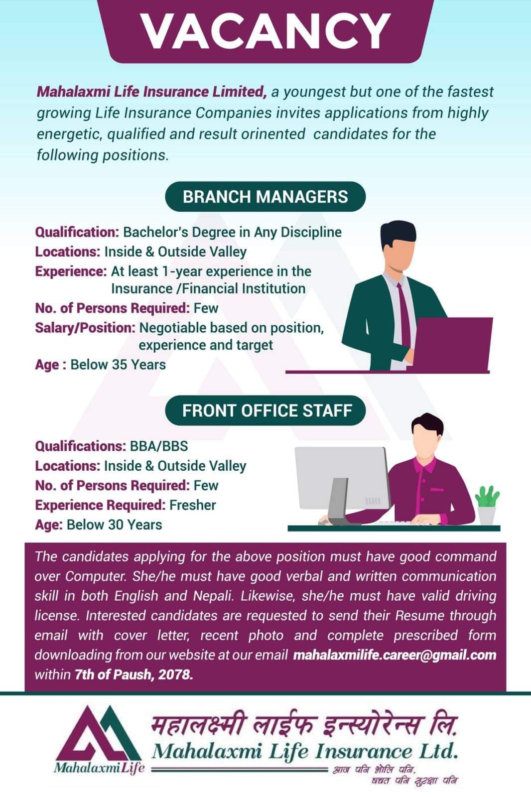काठमाडौं । महालक्ष्मी लाइफ इन्स्योरेन्स कम्पनीले विभिन्न पदका लागि कर्मचारीको माग गरेको छ । कम्पनीले ब्रान्च म्यानेजरका लागि केही र फ्रन्ट अफिस स्टाफका लागि केही संख्यामा कर्मचारीको माग गरेको जनाएको छ ।