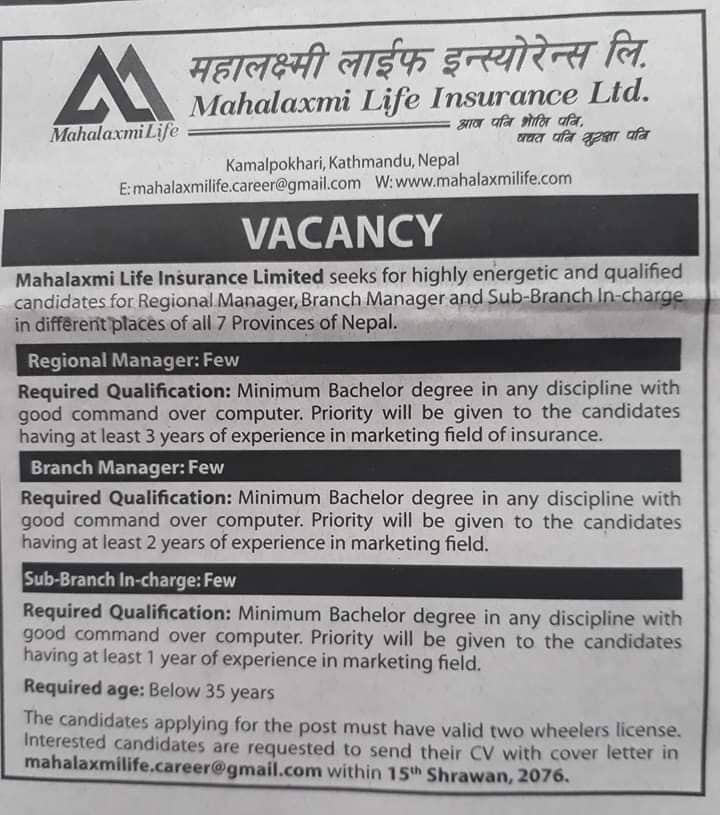 महालक्ष्मी लाइफ इन्स्योरेन्सले विभिन्न पदमा कर्मचरी माग गरेको छ । इन्स्योरेन्सले रिजनल म्यानेजर, ब्राञ्च म्यानेजर र सव ब्राञ्ज म्यानेजर पदमा केही कर्मचारी माग गरेको हो ।