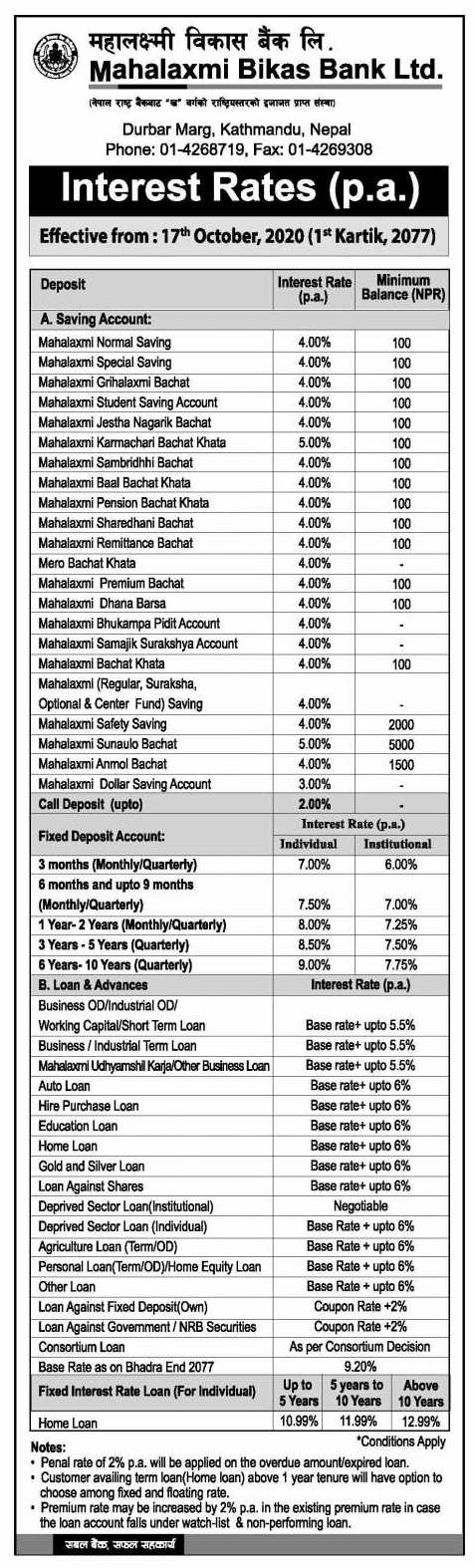 काठमाडौं । महालक्ष्मी विकास बैंक लिमिटेडले नयाँ व्याजदर सार्वजनिक गरेको छ । बैंकले विभिन्न खातामा कार्तिक १ गतेबाट लागू हुने गरी नयाँ व्याजदर सार्वजनिक गरेको हो ।